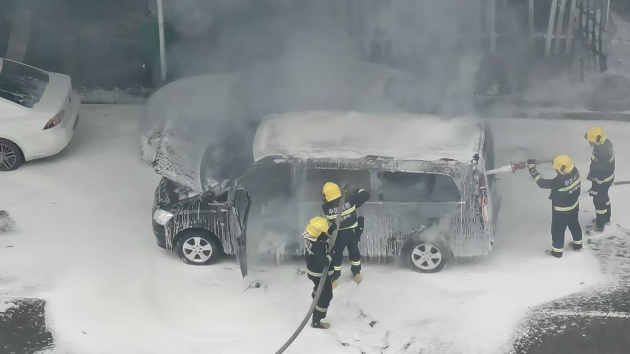 江油广电十字路口一车子燃起来了,幸好消防