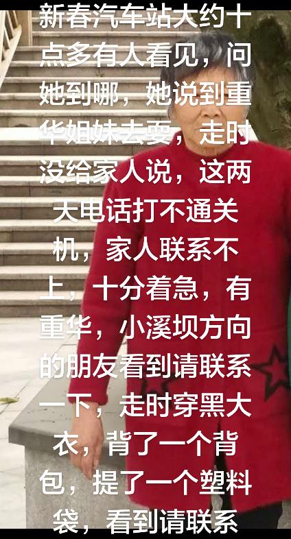 寻人寻人!陈章学,女,78岁,头戴黑色假发,脑袋有问题,四川省江油市永胜镇人,离家时穿黑大衣,黑裤子,棕色皮鞋,有时穿绿棉袄图片上这一身,背上背了个黑包,手提塑料带,于1月1日离家到养马峡山上后,家人和当地几十个人在山上搜寻几天也毫无音讯,她有手机,爱一直拿到手上,电没了,一直联系不上,希望广大朋友多转发,多一双眼睛多一线希望!让我们早日找到她,带她回家!看到此人请留住她!家人必定酬谢!联系电话!15228362375