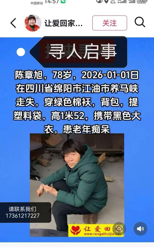 寻人寻人!陈章学,女,78岁,头戴黑色假发,脑袋有问题,四川省江油市永胜镇人,离家时穿黑大衣,黑裤子,棕色皮鞋,有时穿绿棉袄图片上这一身,背上背了个黑包,手提塑料带,于1月1日离家到养马峡山上后,家人和当地几十个人在山上搜寻几天也毫无音讯,她有手机,爱一直拿到手上,电没了,一直联系不上,希望广大朋友多转发,多一双眼睛多一线希望!让我们早日找到她,带她回家!看到此人请留住她!家人必定酬谢!联系电话!15228362375