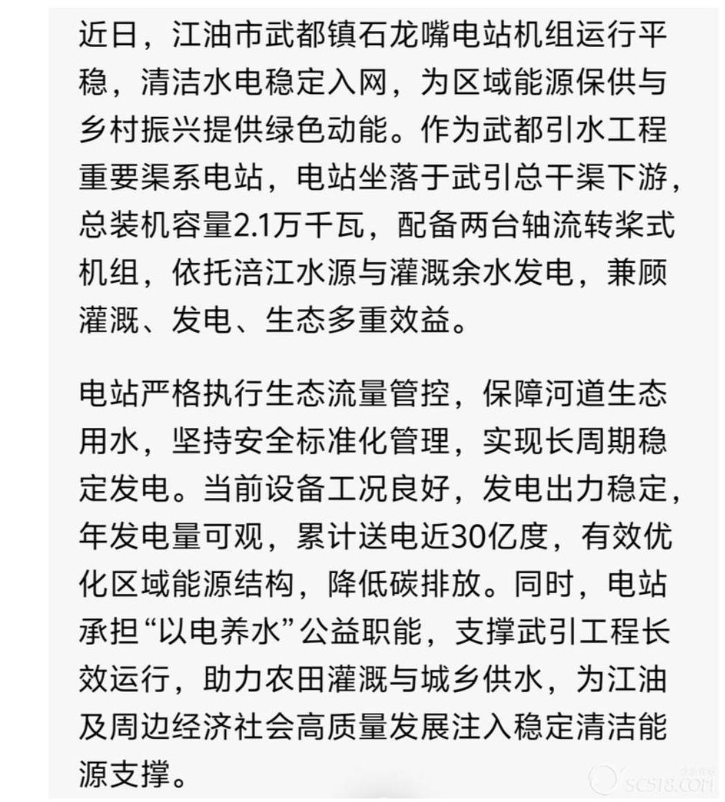 江油聊吧   江油武都石龙嘴电站安全高效运行以水发电惠民生!