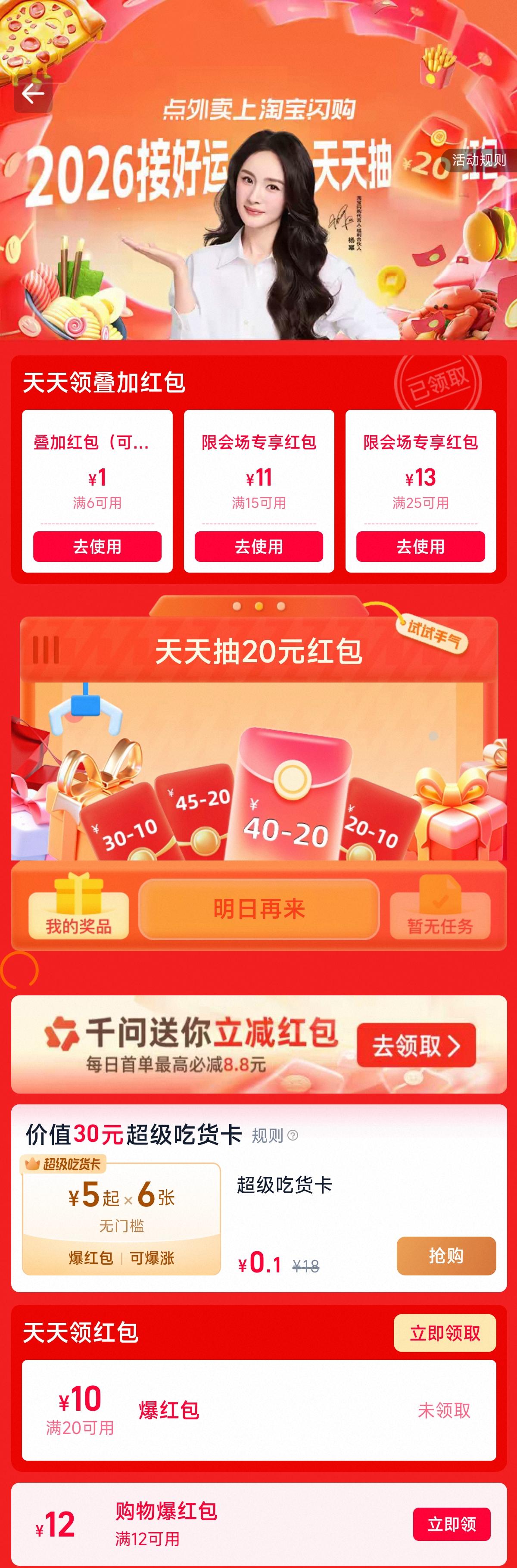 淘宝闪购活动又双叒叕来了,会场红包可领1元叠加红包,会场红包15-11/25-13,天天领红包20-10,超级吃货卡0.1元/6张!!