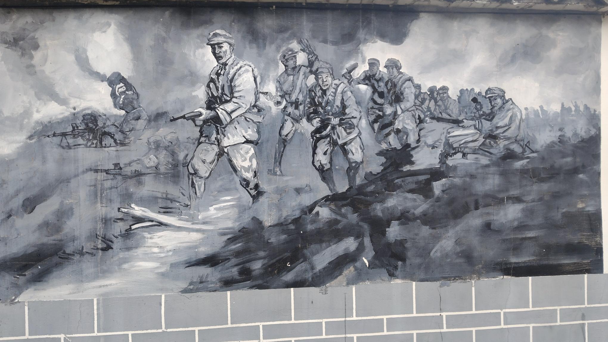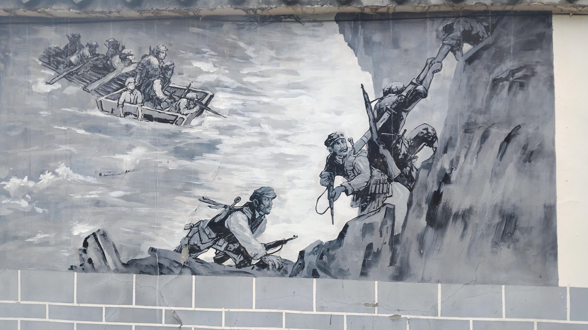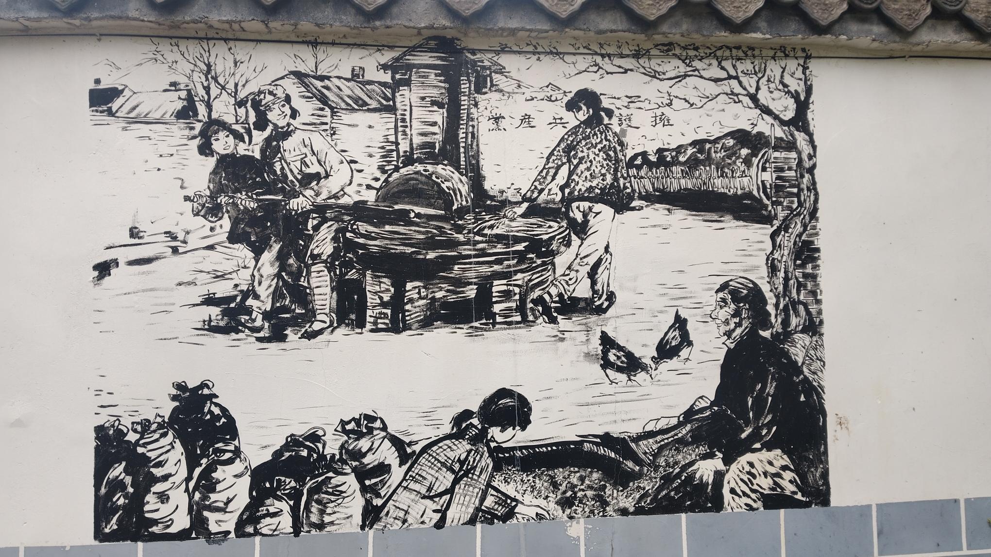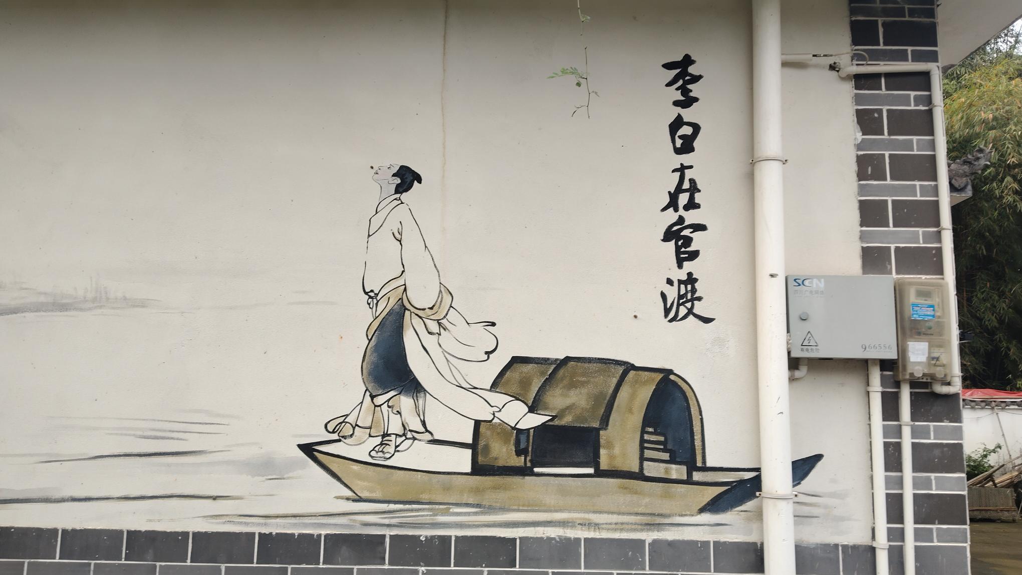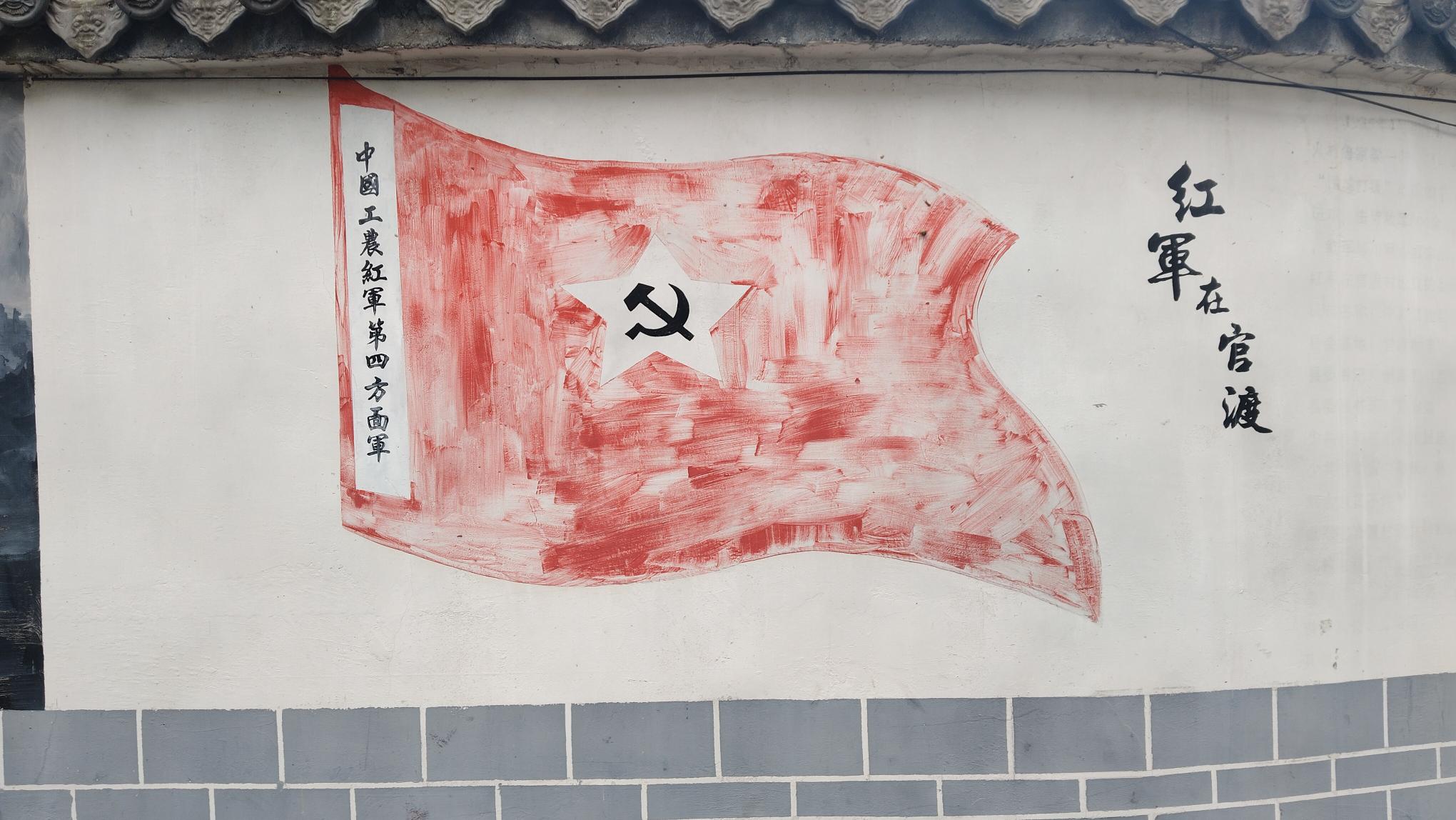 在官渡新村现场看到,新村围墙上绘画有红军和官渡村民在一起,红军用拌桶竹筏涪江河场景,红军与敌人战斗及红军头像图案,另外,在新村还看到,墙壁上还绘画有“官渡场”及“李白在官渡”等。